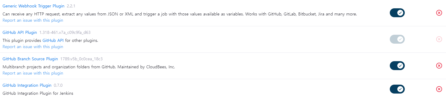 - Jenkins에 plugin 설치 (Webhook Trigger, GitHub Integration, Github API Plugin)