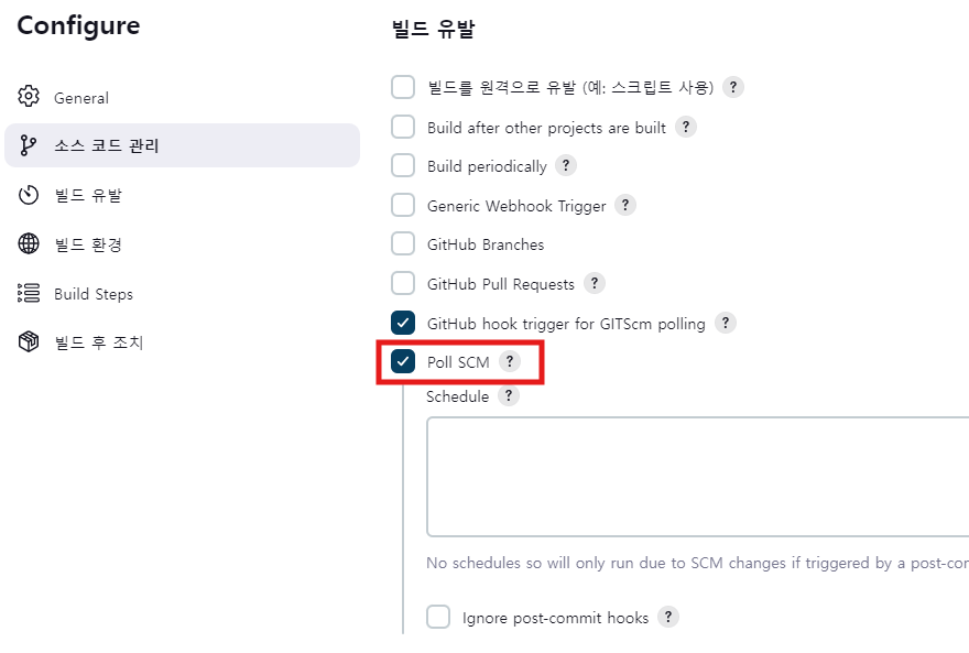 - configure > 소스코드 관리 > 빌드 유발 > Poll SCM