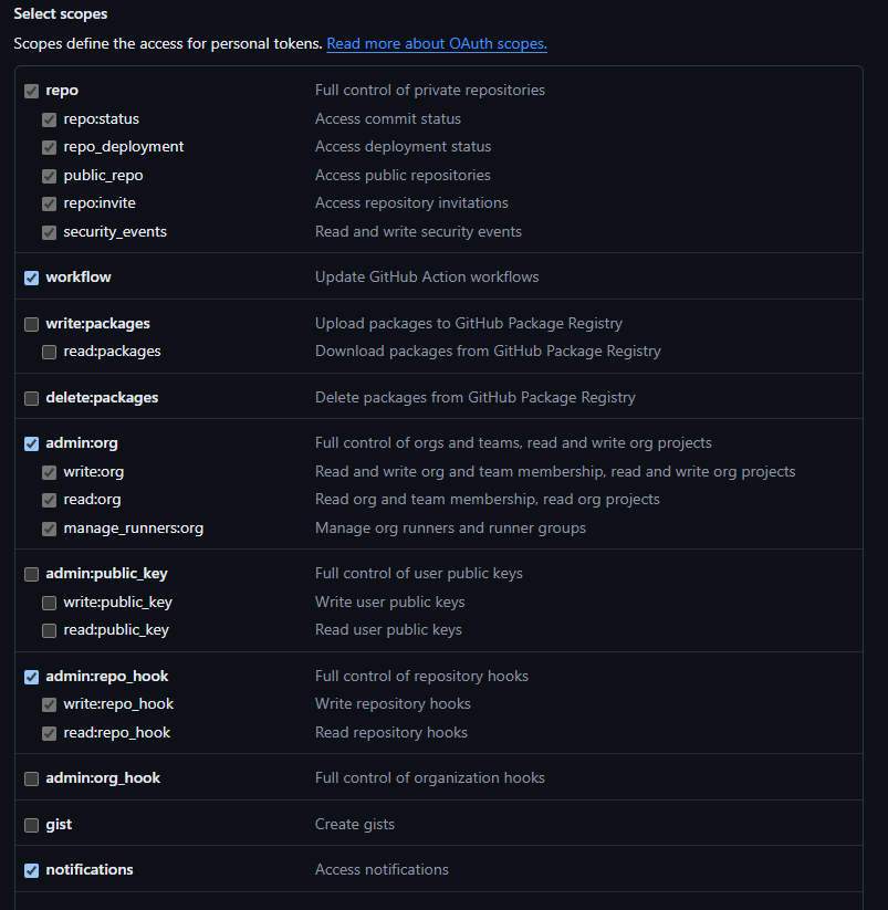 - 필수 : repo, admin:org, admin:repo_hook