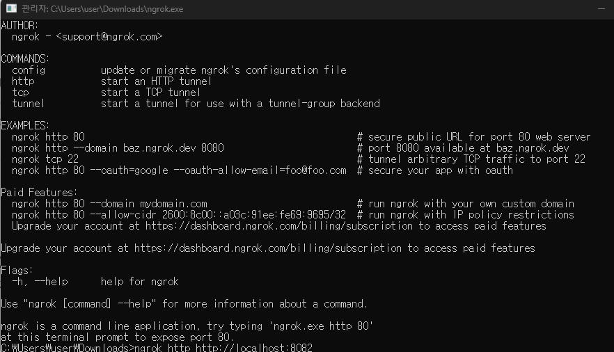 ngrok http http://localhost:8082 입력 (8080은 Tomcat과 충돌우려)