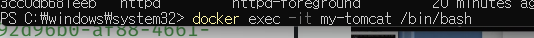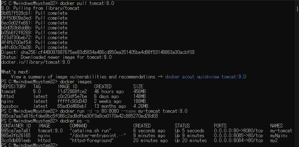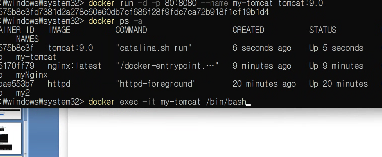 tomcat9.0의 이미지를 이름을이my-tomcat이며 백그라운드에서 기본포트가 8080인 포트를 80으로 컨테이너 생성