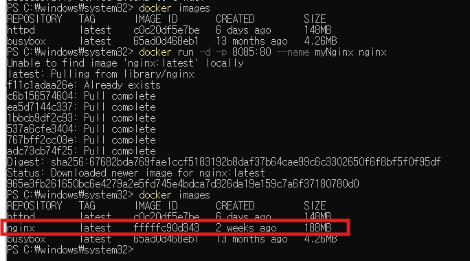 Docker pull : 도커 허브에서 이미지를 다운로드.