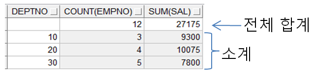 - group by rollup(컬럼명,컬럼명)