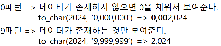 - to_char(값,'pattern');