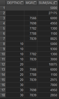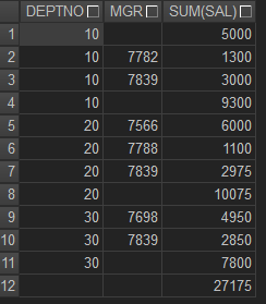 - rollup과 cube는 여러 컬럼이 그룹으로 묶이면 다른 결과를 보여준다.