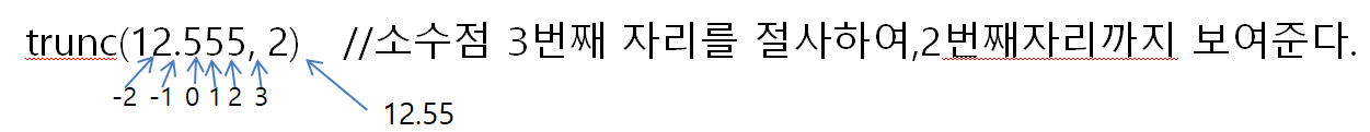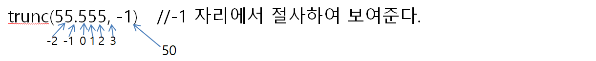 - 절사 : trunc(값), trunc(값, 자릿수)