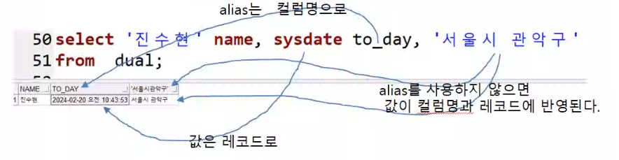 - select에 정의하는 값으로 컬럼을 만들고, 한 행 조회를 수행한다.