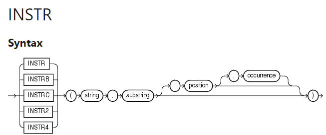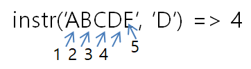 - instr(값, 찾을 문자열, 시작인덱스)