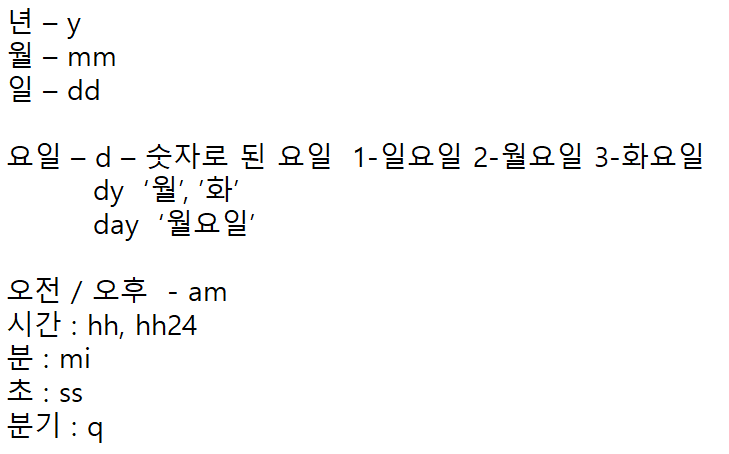 - 날짜 변환 : to_date( 날짜형식의 문자열 ,' 패턴')