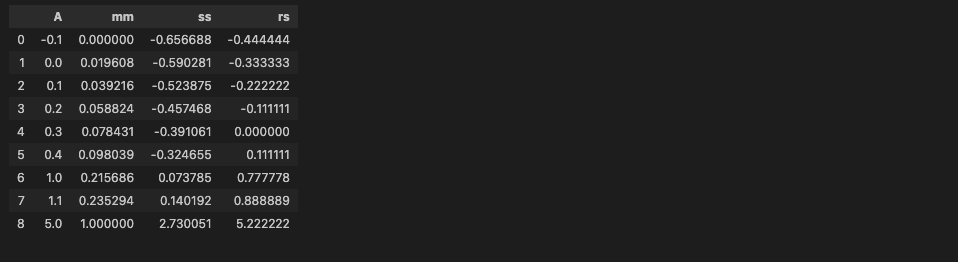 'A' : [-0.1, 0., 0.1, 0.2, 0.3, 0.4, 1.0, 1.1, 5.]