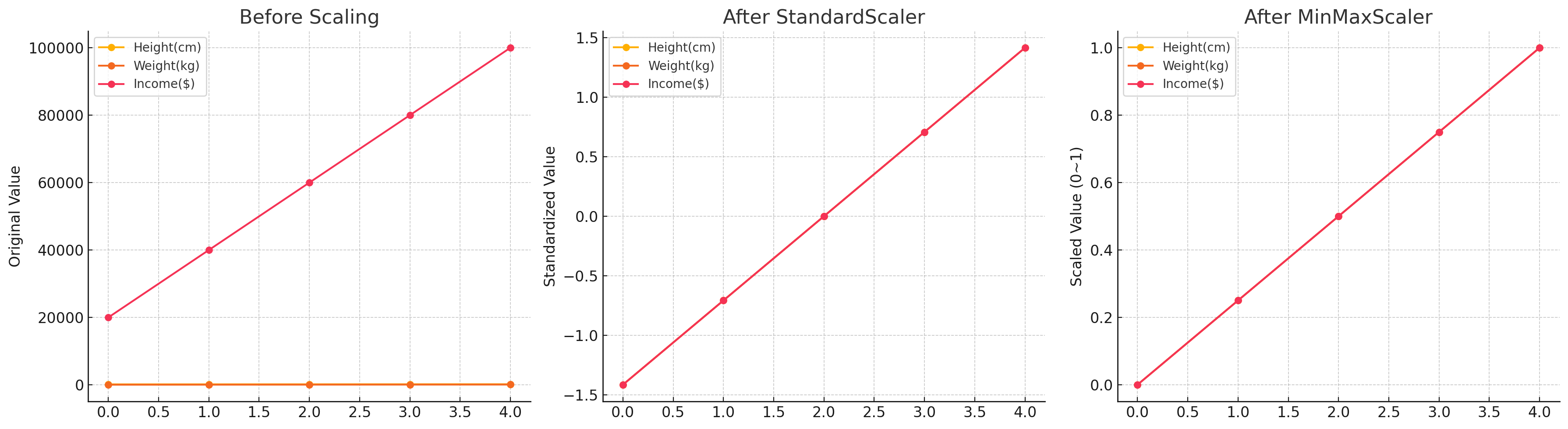 | Income(수입)은 숫자가 너무 커서 키랑 몸무게가 거의 눕다시피 보임 → 이 상태로 머신러닝 돌리면 수입에만 몰빵해서 학습해버릴 가능성 높음 | 모든 특성들이 평균 0, 표준편차 1로 정규화됨 중심은 같지만, 퍼짐 정도가 조절돼서 공평한 느낌 | 모든 특성이 0~1 사이로 딱 맞춰짐. 스케일 통일 = 머신러닝 알고리즘 입장에서 훨씬 처리하기 쉬워짐 |