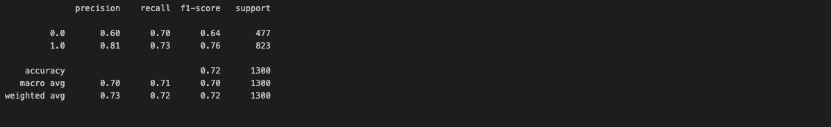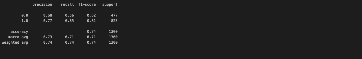 그래서 라벨 0인걸 몇개 맞췄느냐, 라벨 1인걸 몇개를 맞췄느냐 이런식으로 세부적으로 볼 수 있는 classification_report라는 기능이 있다. (precision / recall / f1-score)