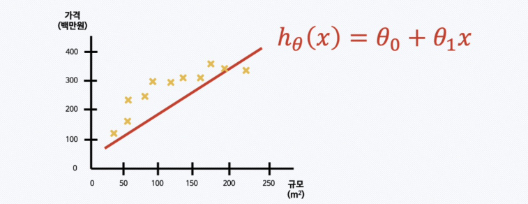 이걸 가설 함수(hypothesis function) 라고 부르고,