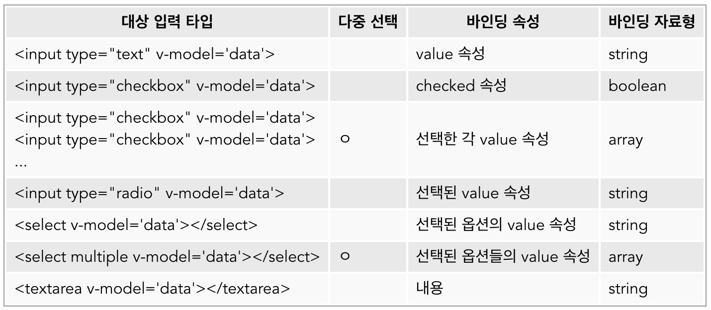 form의 input 요소나 textarea요소, select 요소에 쌍방향 데이터 바인딩을 만들고 싶을 때, v-model 디렉티브를 사용할 수 있다.