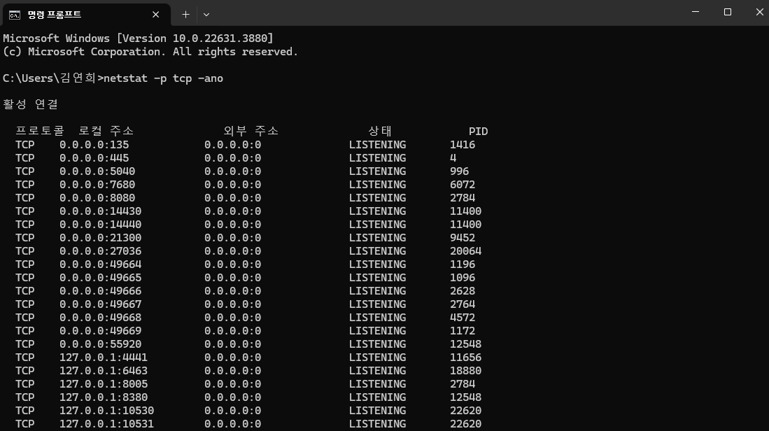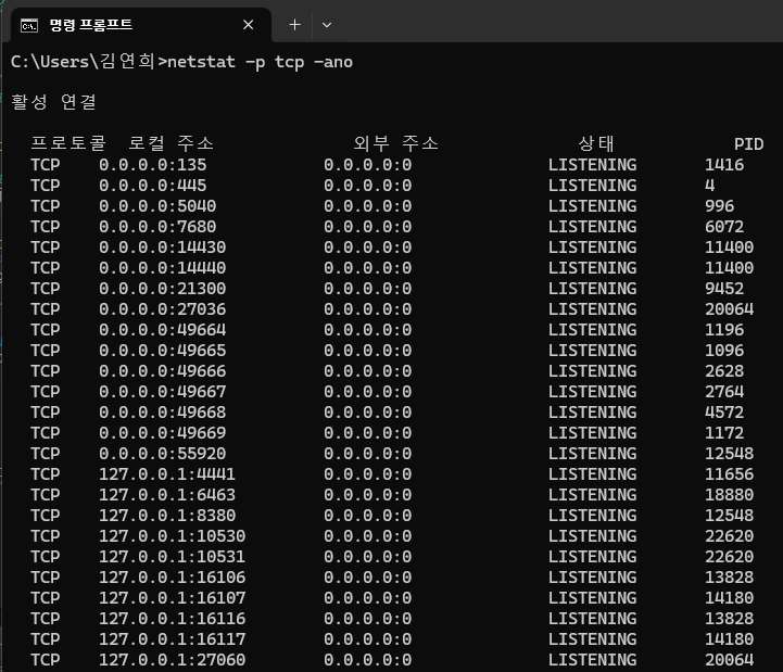cmd에 netstat -p tcp -ano 를 입력 하면 포트에 연결된 모든 pid를 확인할 수 있다.