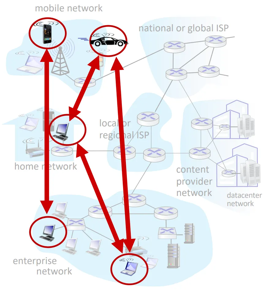 항상 켜져 있는 서버에 의존하며, 애플리케이션이 피어라는 간헐적으로 연결된 호스트 쌍이 서로 직접 통신하게 한다.