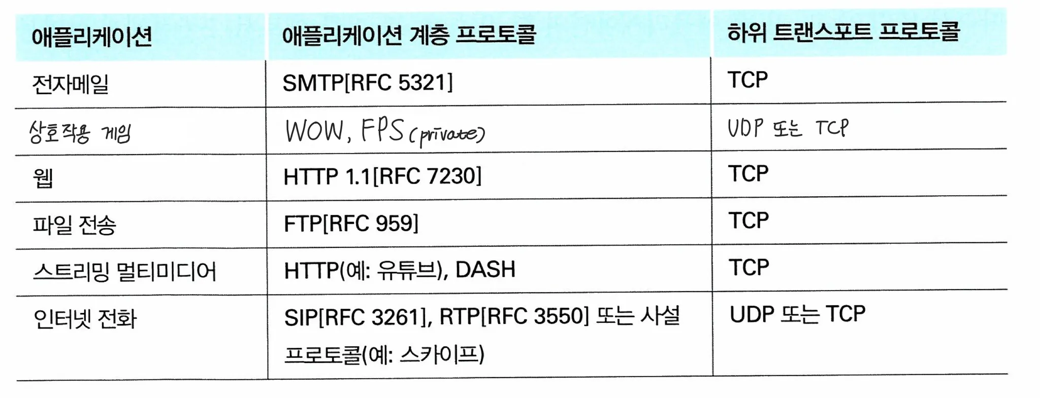 애플리케이션 계층 프로토콜은 다른 종단 시스템에서 실행되는 애플리케이션의 프로세스가 서로 메시지를 보내는 방법을 정의한다. 정의하는 내용은 아래와 같다.