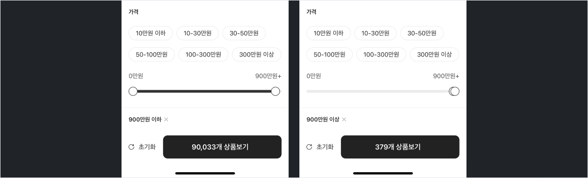 A안. 슬라이더는 손가락으로 범위를 잡기 편하지 않고, 가격 분포도가 필요 이상으로 디테일하고 영역이 넓어 부담스러운 느낌이 든다.
