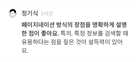 👉🏻 이번 타가는 페이지네이션과 무한스크롤링 각자의 장단점이 확실해서 뭐가 좋고 별로인지 가늠이 어려운 것 같다. 페이지네이션은 특정 정보를 검색하고자 할 때, 무한 스크롤은 방대한 양의 콘텐츠를 탐색할 때, 적합하며 제품 목적에 맞게 선택해서 사용하는 것이 올바른 사용법일 것 같다.