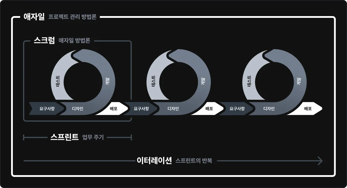 - 스크럼 : 스프린트 안에서 목표를 정하고 우선순위에 따라 제품을 개발하는 방식.