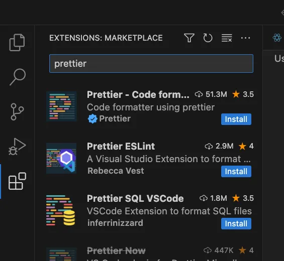 visual studio code의 왼쪽 사이드바에서 extension (블록 모양)을 클릭하고, prettier 를 검색합니다. Prettier - Code formatter 프로그램을 설치(install)합니다.