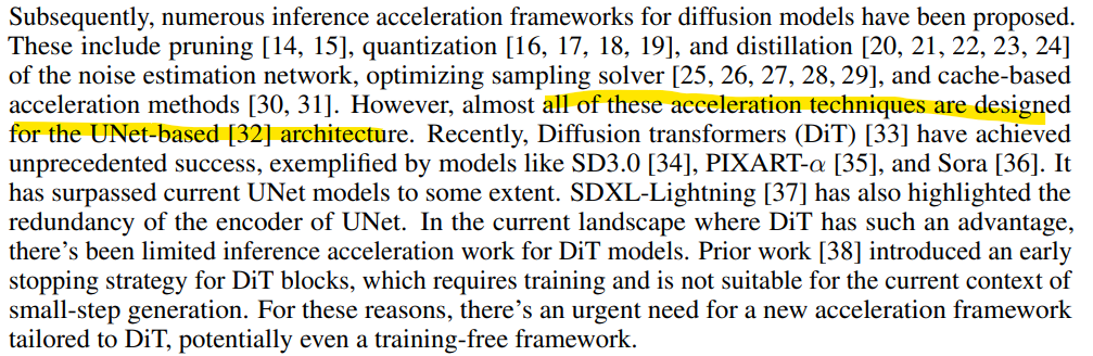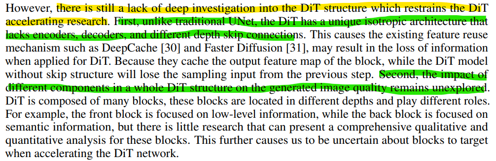 - DiT의 구조의 차별성과 DiT 구조의 영향에 대해서 연구가 덜되어 있어서 DiT accelerating 연구가 어렵다.