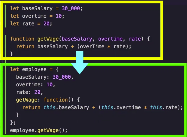 객체 지향적 프로그래밍에서는 속성과 함수를 employee라는 객체에 함께 묶어둔 예시로 여러 employee가 생겨도 employee1, employee2... 등으로 변형해서 사용할 수 있다.