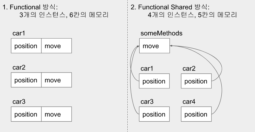 이전의 Functional 방식은 인스턴스를 생성할 때마다 모든 메소드를 someInstance에게 할당하므로, 각각의 인스턴스들이 메소드의 수 만큼의 메모리를 더 차지하기 때문이다.