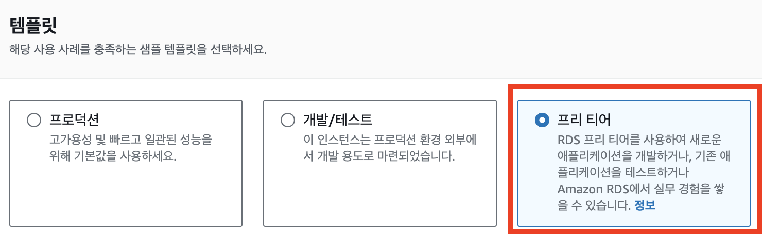 템플릿은 서버를 생성했을 때와 마찬가지로 무료버전인 프리티어를 선택했다.