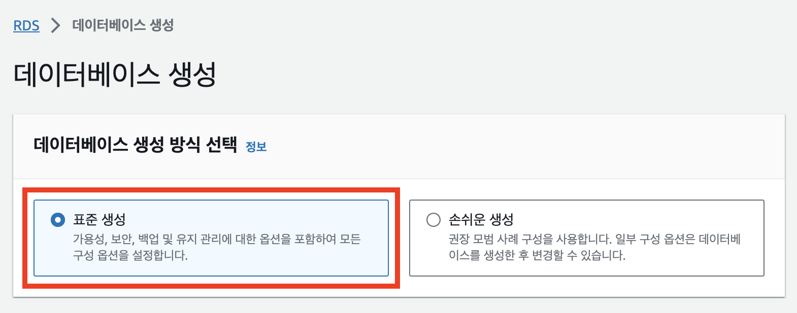 데이터 베이스 생성 방식은 표준 생성을 선택한다.