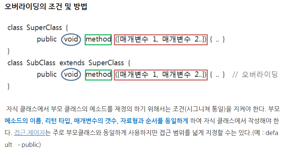 오버라이딩(overriding) = 상속받은 기존의 메소드를 재정의하는 것