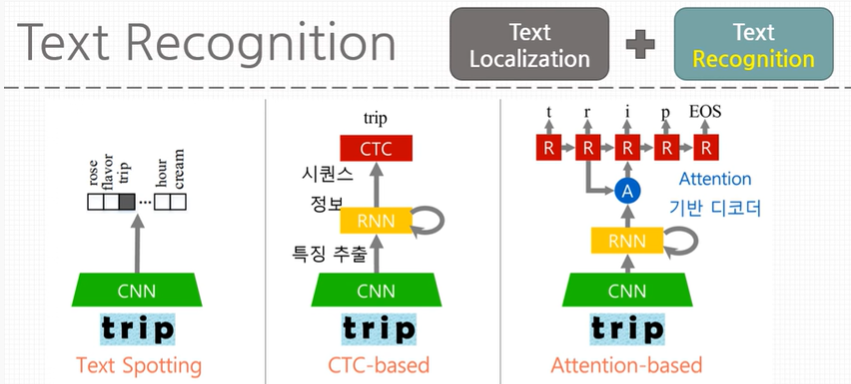 보통 recognition은 image classification인데, text recognition의 경우는 시퀀스를 classification해야 한다. 즉 글자 하나하나를 분류해야된다.