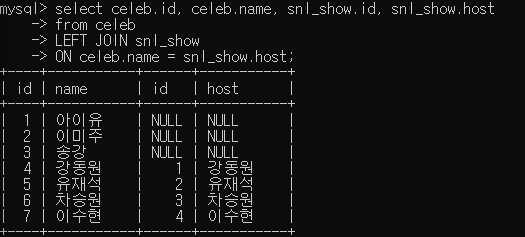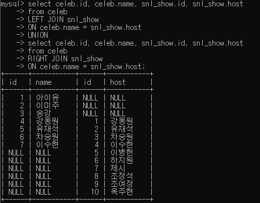MySQL 에서는 FULL JOIN을 지원하지 않고 있기 때문에, 아래와 같은 쿼리를 이용해야함
