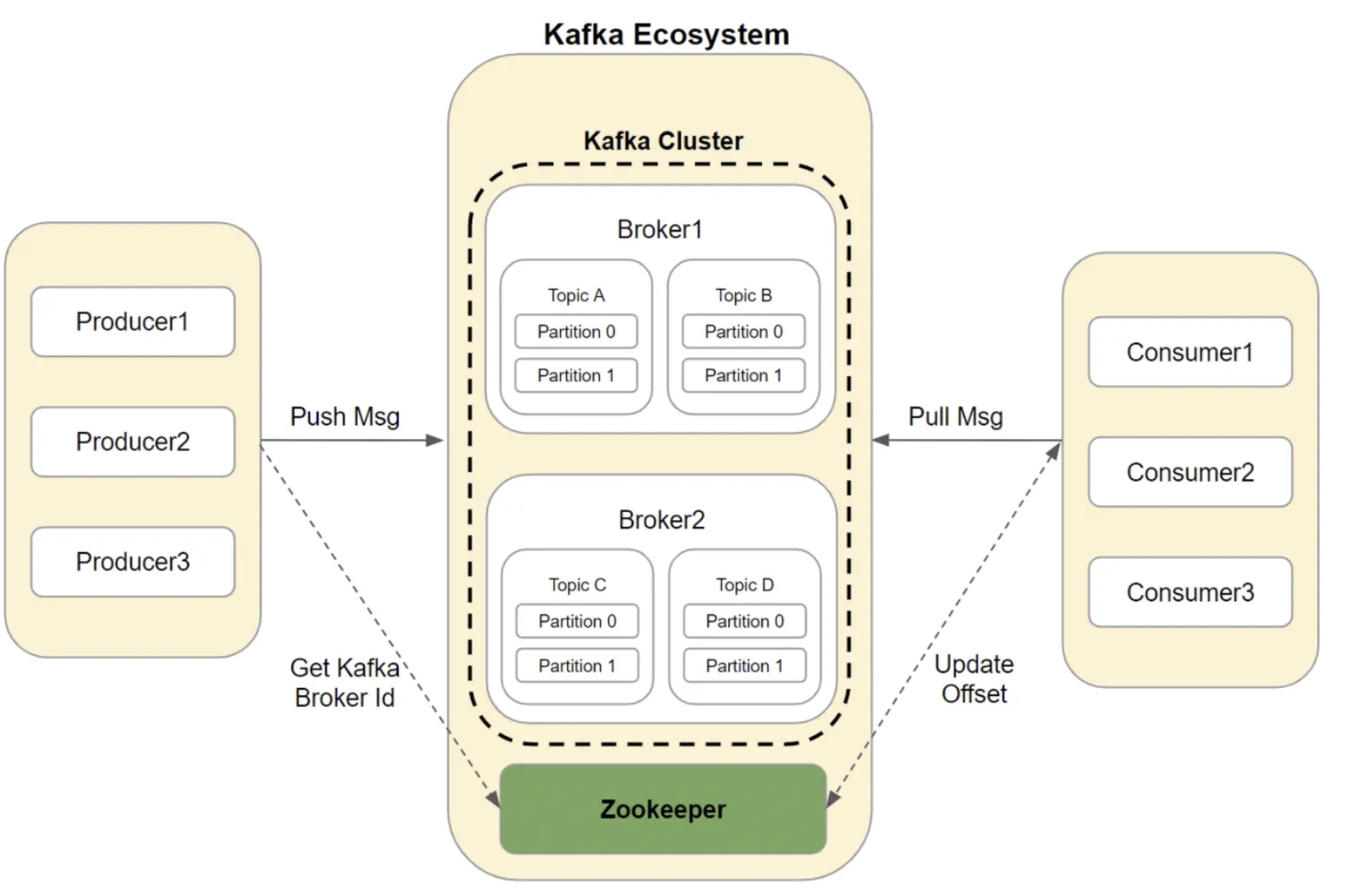 - Kafka Cluster : 여러 개의 Broker들로 구성됨 (최소 3개이상, 4개 이상을 권장)