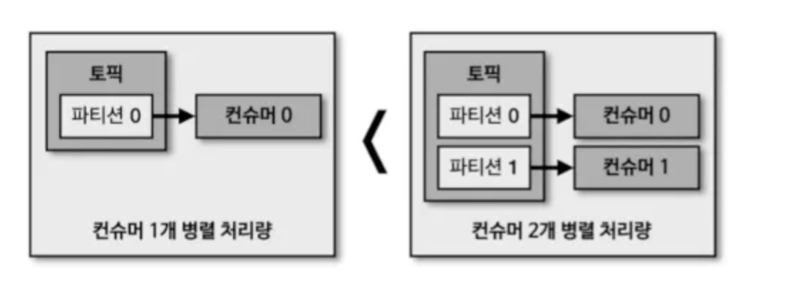 - 파티션 개수만큼 컨슈머 개수를 늘려서 동일 시간당 데이터 처리량을 늘릴 수 있다.