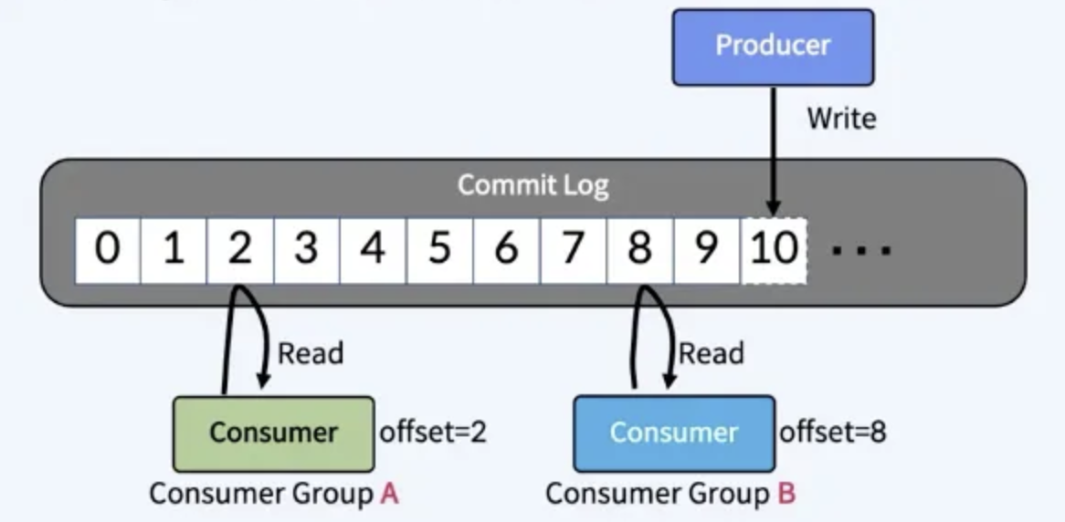 - Producer와 Consumer는 서로 알지 못하며, Producer와 Consumer는 각각 고유의 속도로 Commit Log에 Write 및 Read를 수행한다.