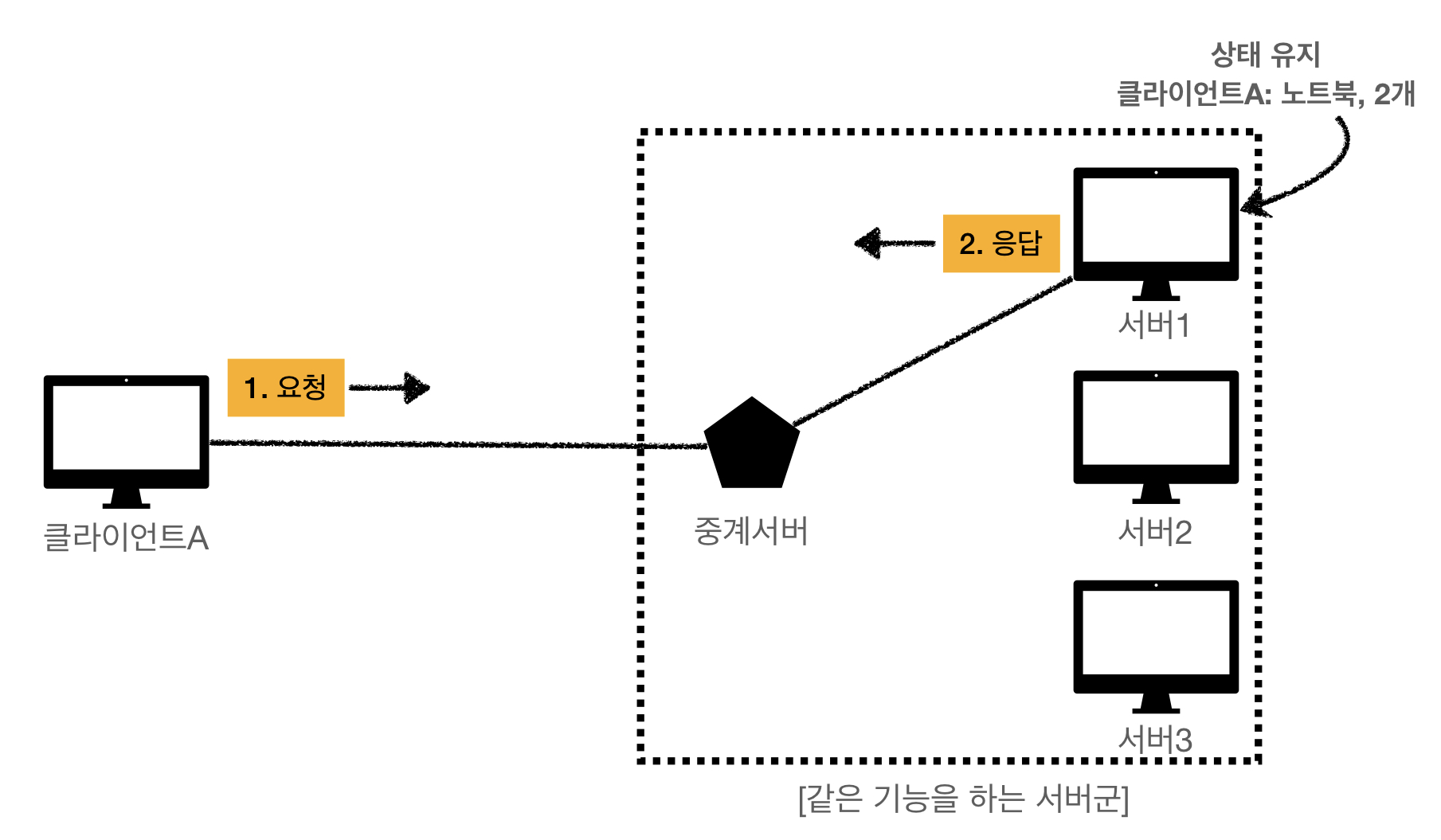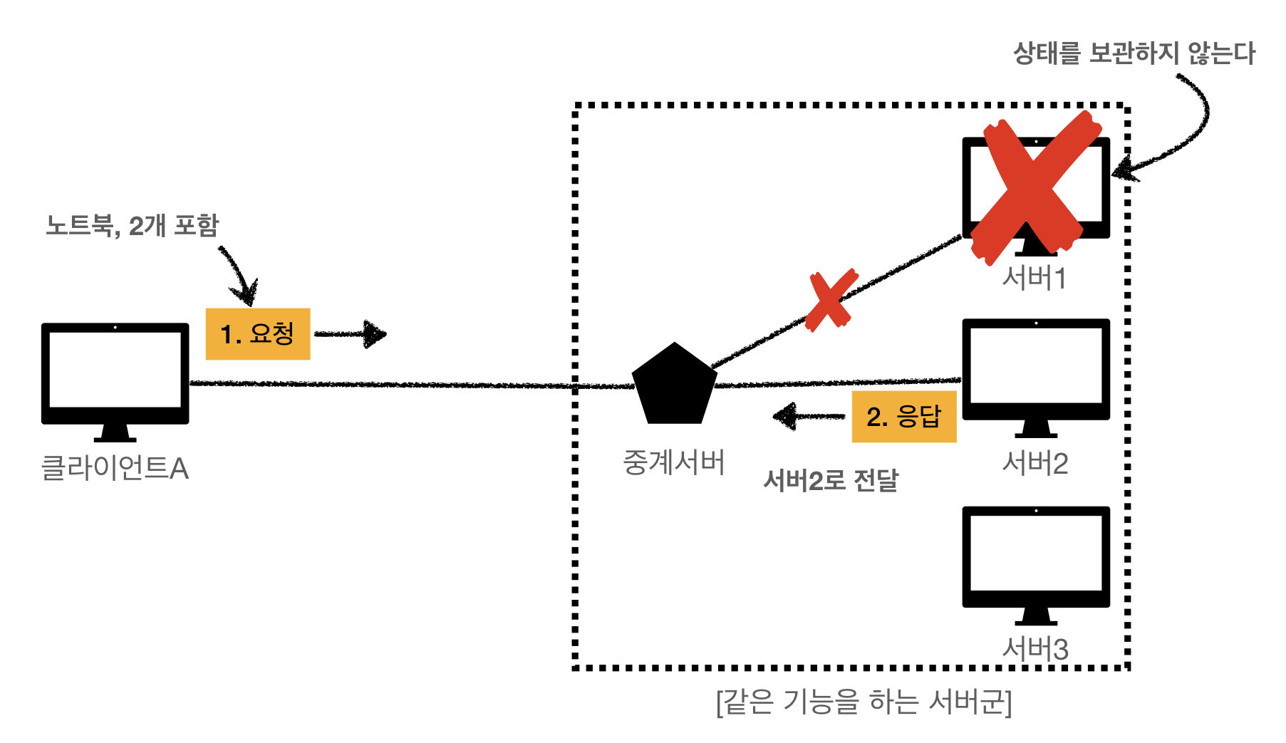 아무 서버나 호출할 수 있다. 클라이언트가 상태를 모두 포함해 요청하기 때문에 서버가 상태를 보관할 필요 없다. 중간에 서버가 장애나면 다른 서버가 응답을 전달할 수 있다.