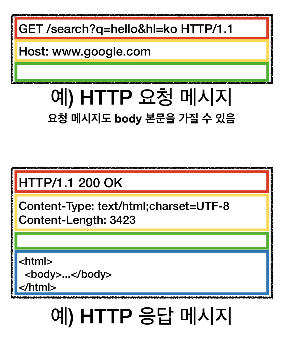HTTP 메세지 구조는 시작 라인과 헤더, 공백 라인(CRLF), 메세지 바디로 나눠진다. 공백 라인은 무조건 있어야 하고, HTTP 요청 메세지에서 메세지 바디가 존재하지 않을 수도 있다.