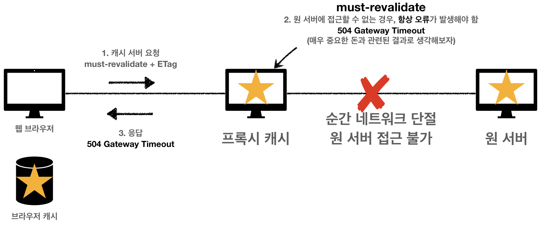 Cache-Control: must-revalidate 는 캐시 만료 후 최초 조회시 원 서버에 검증해야 하는 것이다. 원 서버에 접근을 실패하면 반드시 오류가 발생해야 한다.