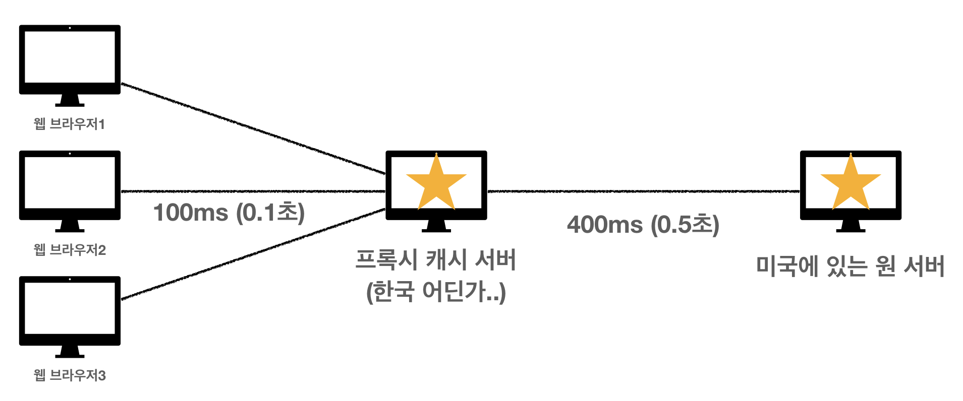프록시 캐시를 도입하면 최초 요청 시에만 원 서버에 접근하고 그 후에는 프록시 캐시 서버에 접근하기 때문에 속도가 빨라진다.