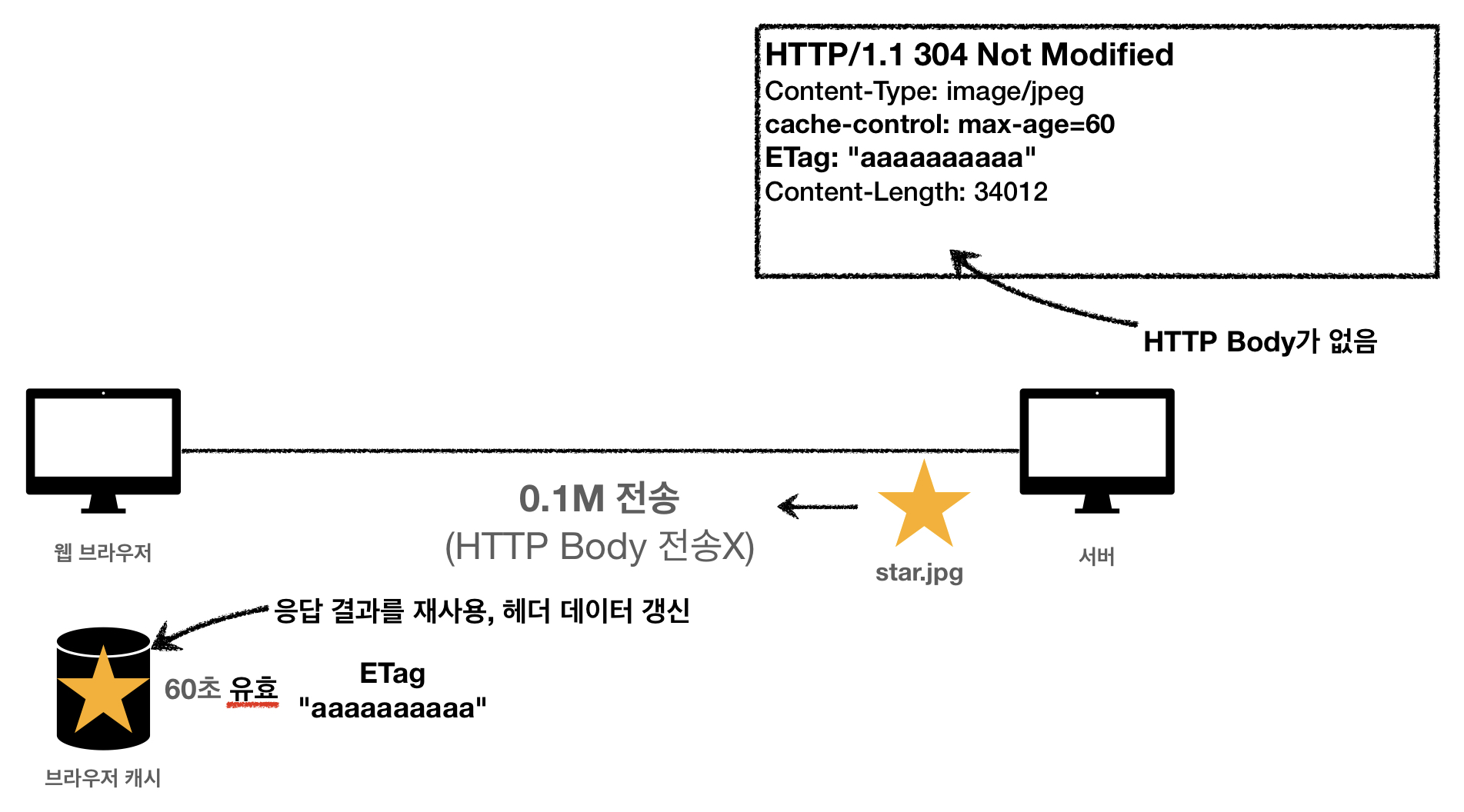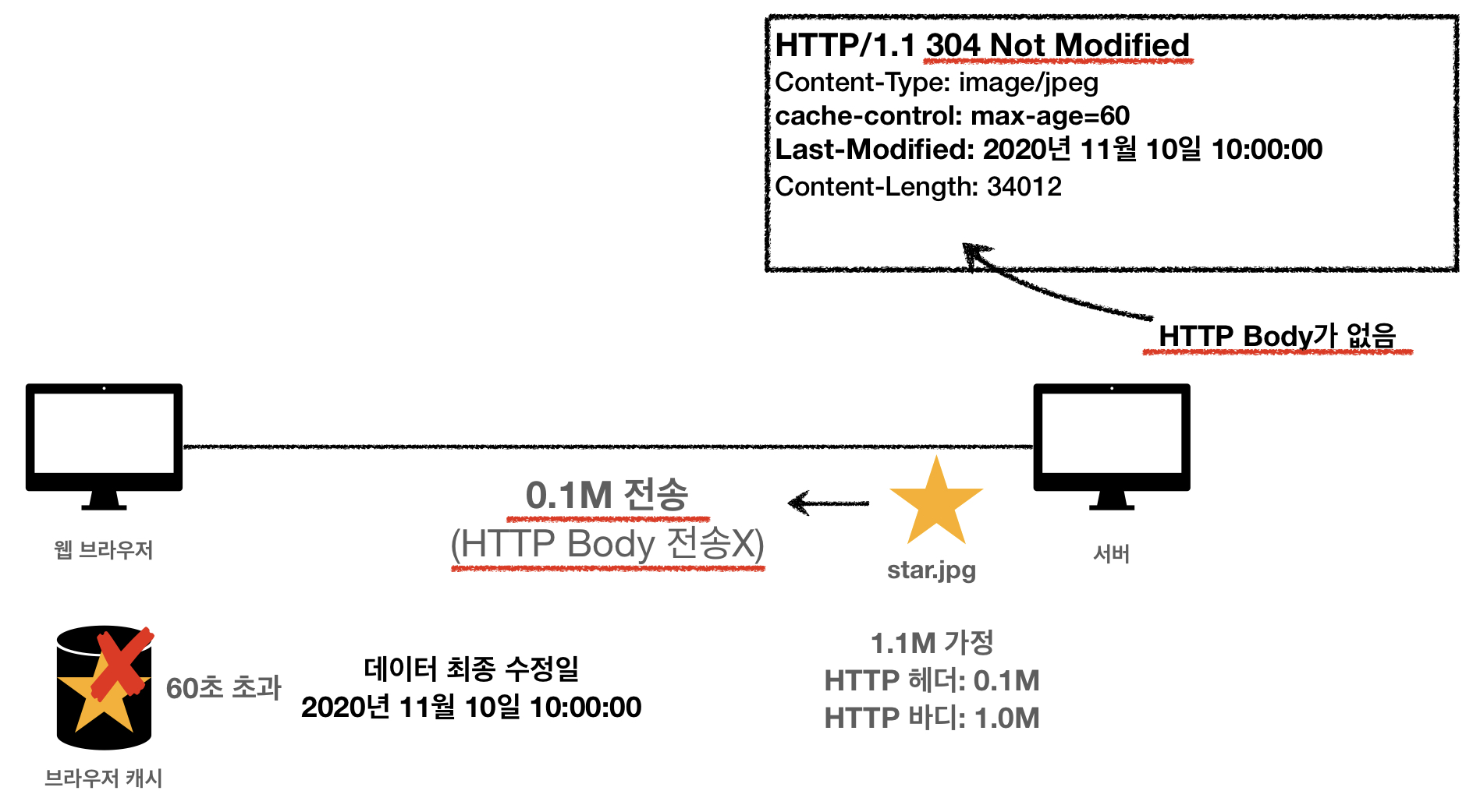 캐시 유효 시간이 초과해도 서버의 데이터가 갱신되지 않으면 304 Not Modefied 와 헤더 메타 정보만 응답한다.