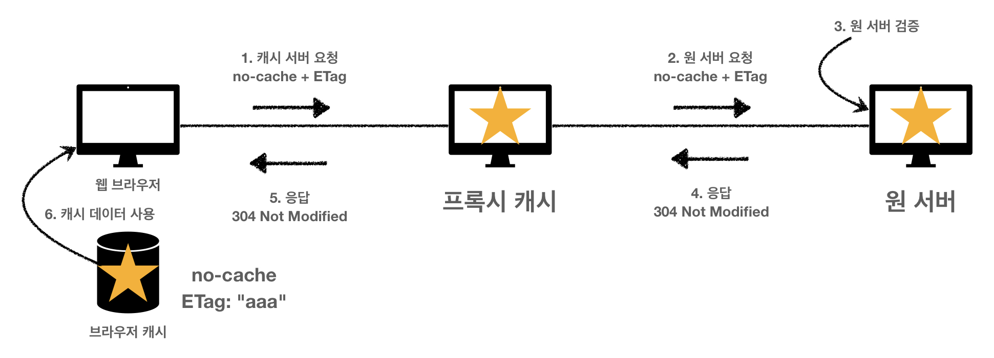 no-cache는 캐시 서버를 요청하면 프록시 캐시가 원 서버에 요청하여 원 서버가 검증한다.