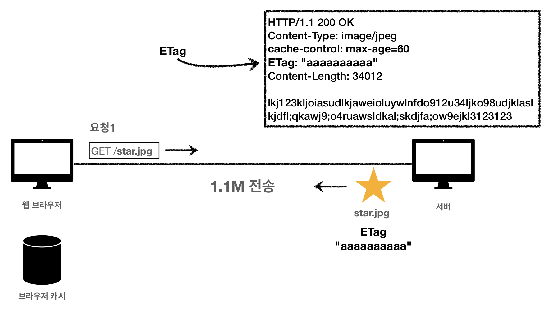 처음으로 요청이 들어오면 임의의 이름을 ETag 헤더에 넣어 응답 결과를 브라우저 캐시에 전송한다.