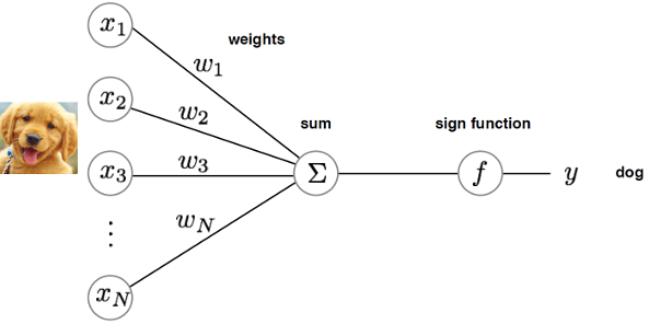 여기서 f(⋅)는 sign 함수(이진 분류) 또는 sigmoid/ReLU 같은 활성화 함수이다.