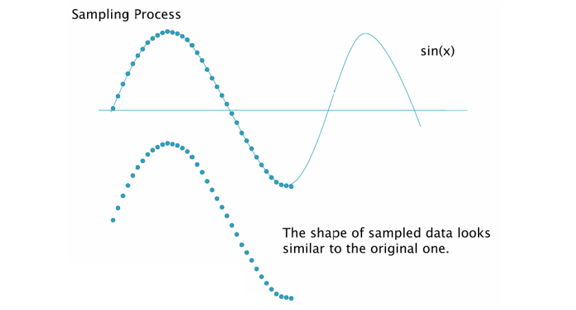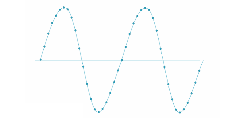 원본 신호를 Sin(x) 곡선으로 가정했을 때, 위 그림에서 파란 점들은 일정 간격으로 샘플링한 값들을 의미한다. 이 점들의 간격이 촘촘하면, 원본 신호의 모양을 잘 보존한다.