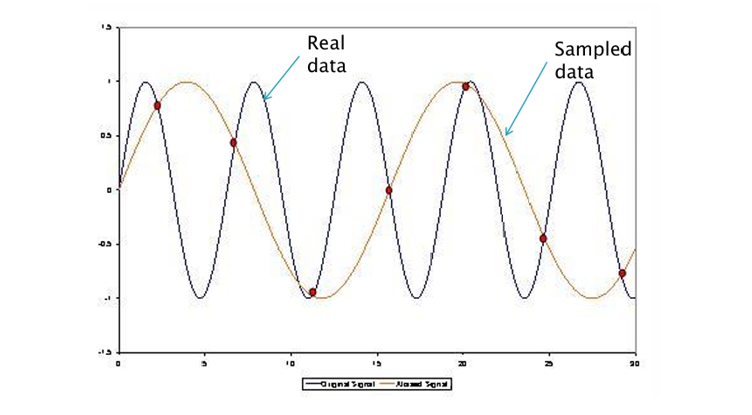 위 그림에서 Real Data(원본 고주파 신호), Sampled Data(샘플링 후 복원된 신호)를 확인해보면, 샘플링 간격이 크기 때문에, 원본과 전혀 다른 패턴(잘못된 주기)이 나타남을 확인할 수 있다. 이것이 바로 Aliasing 현상이다.
