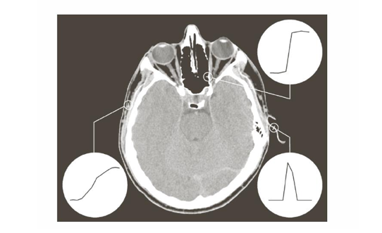 CT 영상 예시를 확인해보면, 위 세 가지 모델이 나타남을 확인할 수 있다. Step Edge는 뼈와 연조직 경계처럼 명확하게 구분되는 영역, Ramp Edge는 연부 조직과 같은 경계가 흐린 부분, Roof Edge는 혈관, 가느다란 구조물 등에서 보인다.