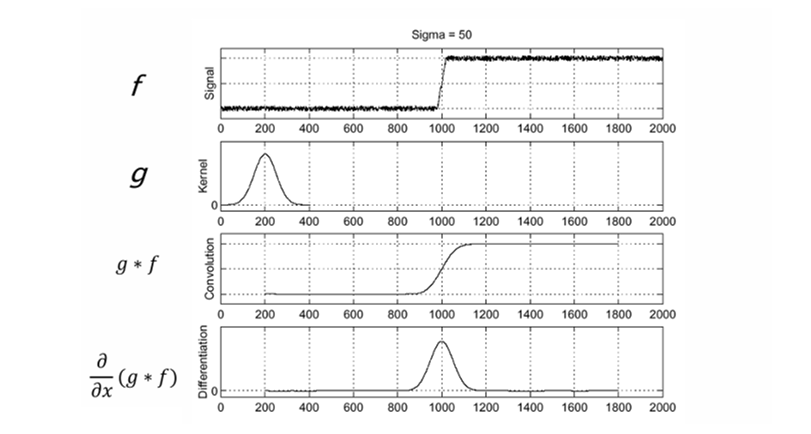 위 그래프에서 볼 수 있듯이, 원본 신호 는 노이즈가 심하지만, 는 완만한 곡선이 되고, 이를 미분한 결과는 경계 위치에서 뚜렷한 피크만 남는다.