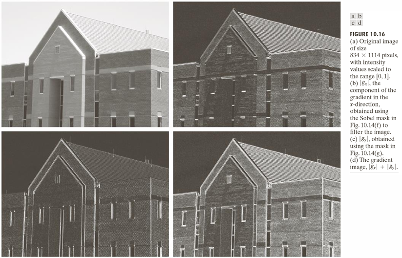 아래 그림은 Sobel masks를 이용한 엣지 검출 과정을 단계별로 보여주는 예시이다. 원본 이미지는 (a)이다.