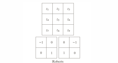 2x2 크기의 마스크를 사용하여 대각선 방향의 기울기를 계산한다. 연산량이 적고 단순하지만, 잡음에 민감하고 에지 두께를 일정하게 유지하기 어렵다. 주로 빠른 에지 검출이 필요할 때 사용한다.